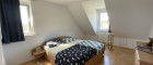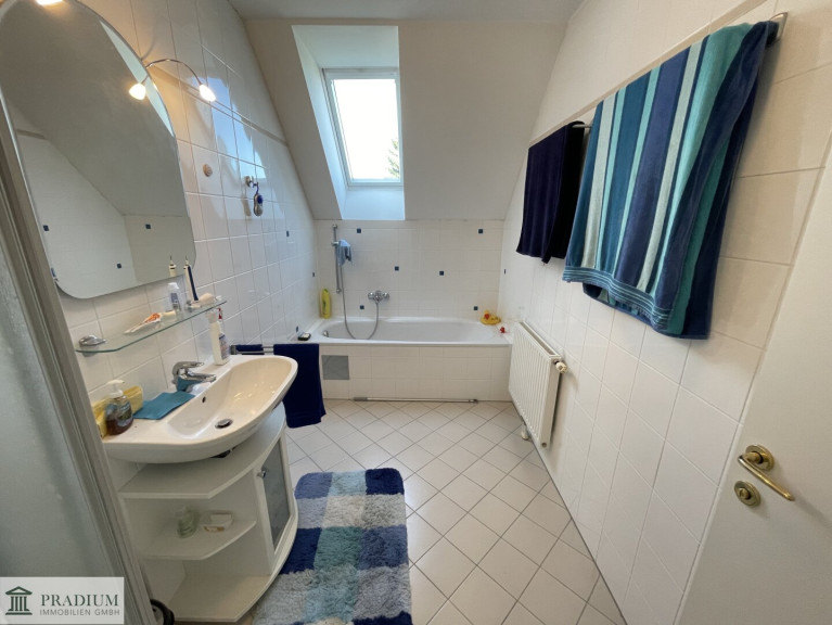 Über die Holztreppen in der oberen Wohnebene angekommen findet man 2 Zimmer, 1 Badezimmer und 1 WC. Eines der beiden Zimmer ist derzeit als Ankleidezimmer genutzt. Das derzeitige Schlafzimmer ist großzügig bemessen, sodass Doppelbett, Kommode und Kasten bequem Platz finden.