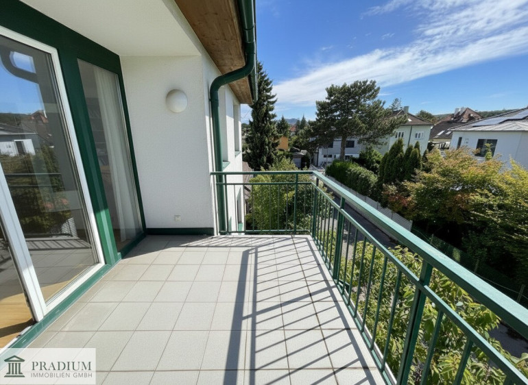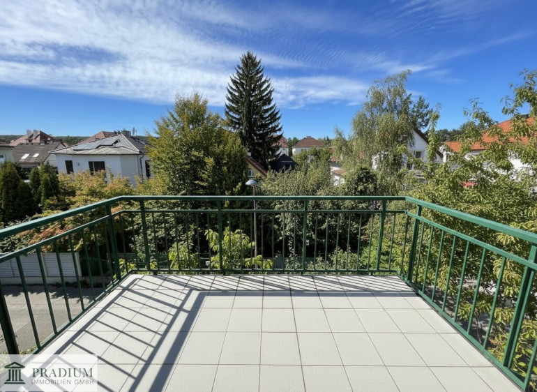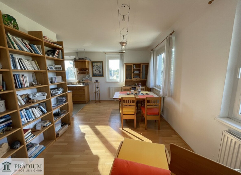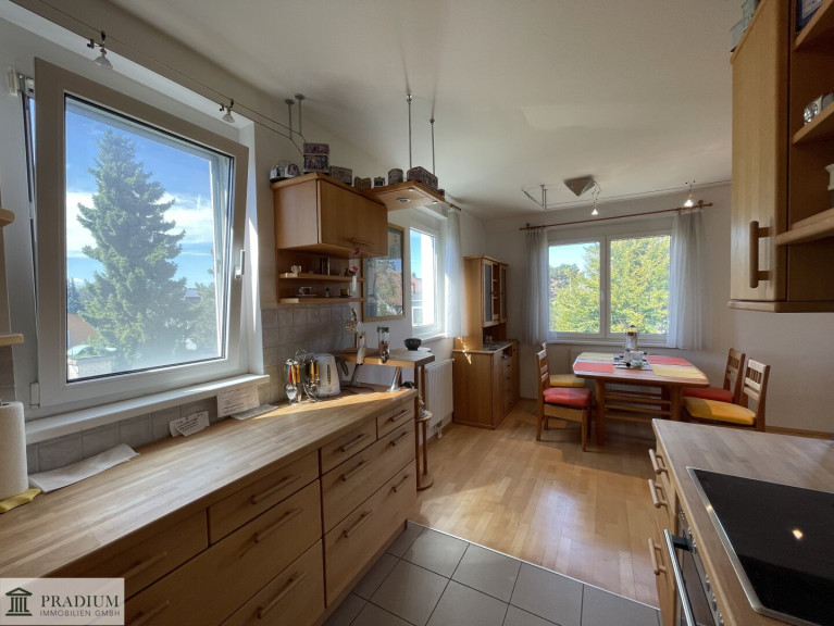 Dem Blick folgend betritt man den großen Wohnraum, der sich einerseits in den hellen Wohnbereich mit Ausgang auf die Terrasse, sowie dem Esszimmer und der Einbauküche. Dieser Bereich ist sehr offen gestaltet und durch die vielen Fenster sehr hell. Die Terrasse besticht mit einem herrlichen Grünblick über Einfamilienhäuser. Stellen Sie sich vor, wie Sie an warmen Sommerabenden die frische Luft und die herrliche Umgebung genießen.