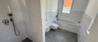 - Badezimmer mit WC, Dusche, Waschbecken und Fenster
