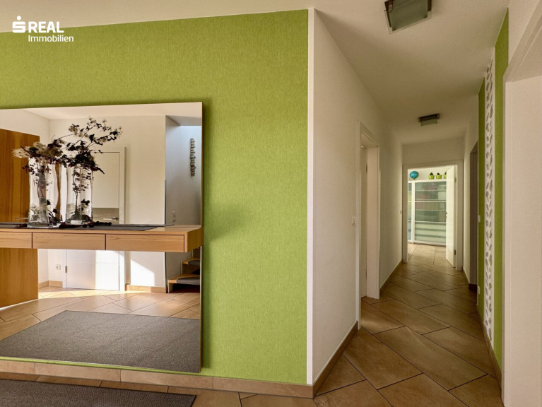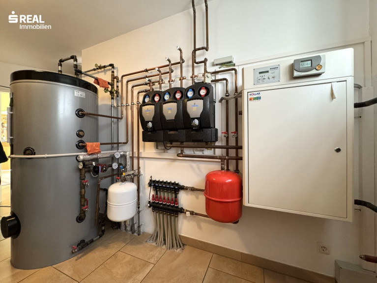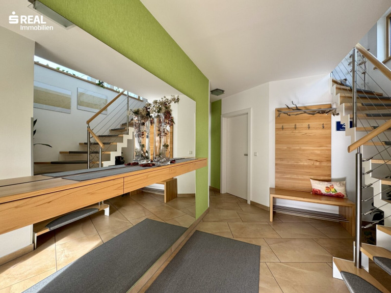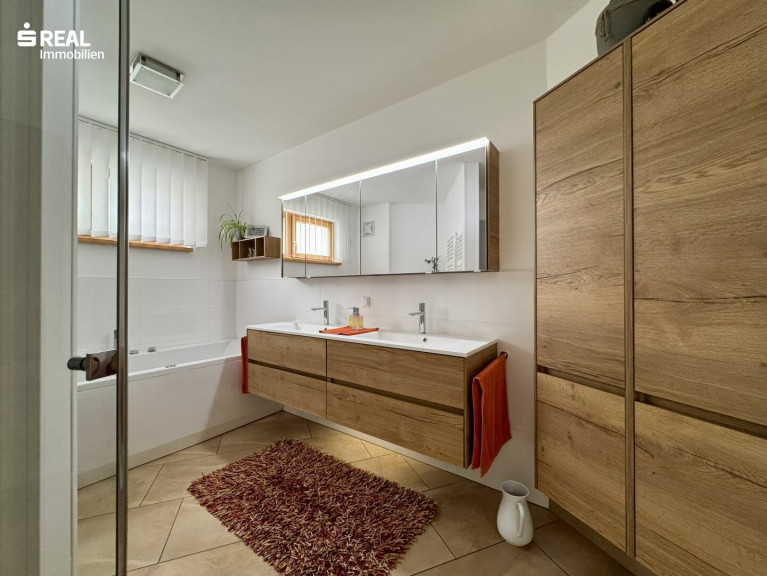 Ein weiteres, kürzlich modernisiertes Badezimmer, der Technikraum sowie eine Schleuse welche direkten Zugang zur Garage ermöglicht, befinden sich ebenfalls im Erdgeschoß. Die Schleuse selbst wird als Garderobe benutzt, somit bleibt der Eingangsbereich aufgeräumt.