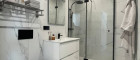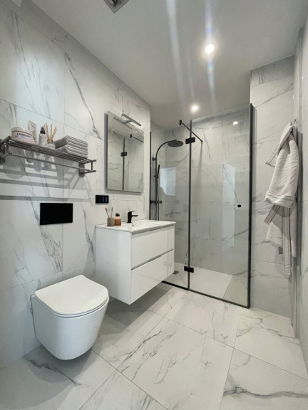 Im Wohnbereich sind hochwertige Parkettböden verlegt, während die Badezimmer mit edlen 60x60 cm Marazzi-Fliesen und bodengleichen Walk-in-Duschen ein exklusives Ambiente schaffen. Die modernen Küchenzeilen sind mit Induktionskochfeld, Mikrowelle, Kühlschrank sowie einer Design-Spüle mit schwarzen Armaturen ausgestattet.