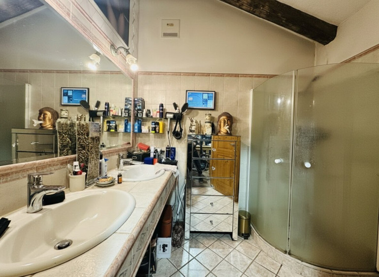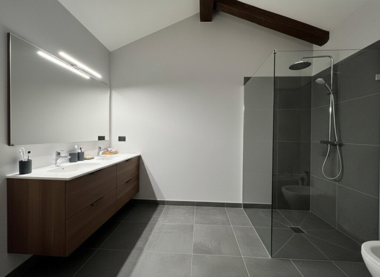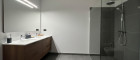 Bad mit Doppelwaschtisch und Dusche; zusätzliche Sanitärflächen möglich.