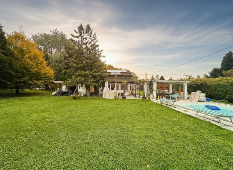 Großer Garten mit Rasenflächen, Baumbestand und Privatsphäre.