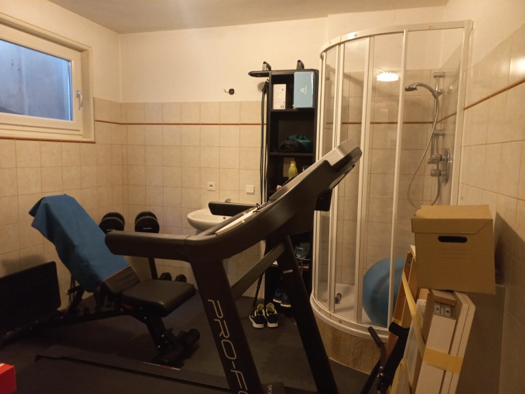 - Der Kellerraum ist gefliest und verfügt wie das ganze Haus über eine Fußbodenheizung. Weiters ist eine Dusche, ein Waschbecken und ein Starkstromanschluss vorhanden. Ideal für die Nutzung als Sportraum.