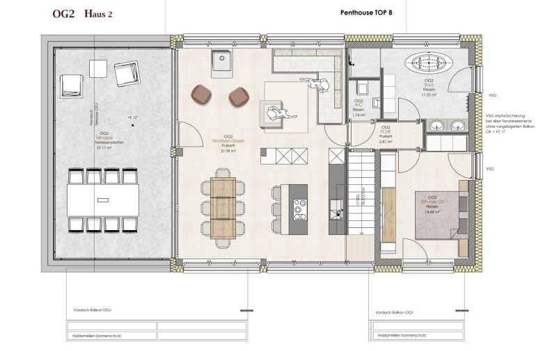 - Raffstoreelemente: An allen Ost-Süd-West-Fassaden positioniert sorgen sie für effektive Lichtregulierung, Sichtschutz und zusätzliche Wärmedämmung, um eine angenehme Raumatmosphäre zu schaffen.