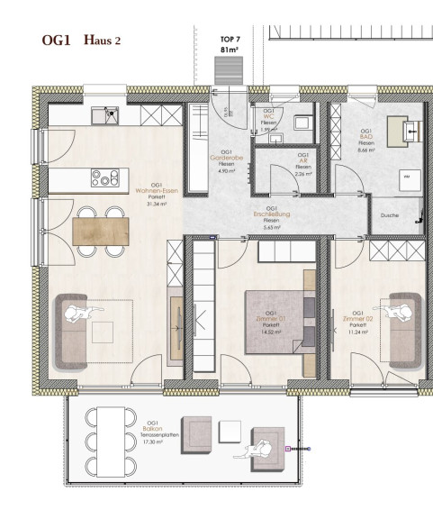 - Wohn-Ess-Küchenbereich: Ein großzügiger und offener Bereich, der zum Verweilen einlädt und direkten Zugang zum ca. 17 m² großen, südseitigen Balkon bietet – perfekt für gesellige Abende im Freien.