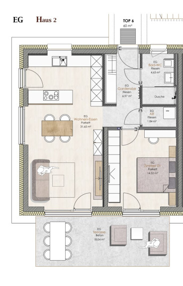 Willkommen in Ihrer neuen Eigentumswohnung im Herzen des Ennstals! Diese Erdgeschosswohnung (TOP 6) bietet Ihnen ca. 60 m² Wohnfläche und besticht durch ihre durchdachte Raumaufteilung sowie eine hochwertige Ausstattung. Die süd-west-nordseitige Ausrichtung sorgt für eine herrliche Lichtdurchflutung, während die ca. 18 m² große südseitige Terrasse ein perfekter Ort ist, um die Sonne und die frische Luft zu genießen.