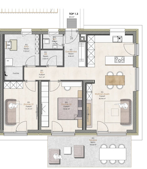 Willkommen in Ihrer neuen exklusiven Eigentumswohnung im Erdgeschoss (TOP 1.3) im Ennstal! Diese attraktive Wohnung bietet Ihnen ca. 81 m² Wohnfläche und überzeugt durch eine durchdachte Raumaufteilung sowie eine hochwertige Ausstattung. Mit einer ca. 18 m² großen, südseitigen Terrasse und einer süd-ost-nordseitigen Ausrichtung genießen Sie tagsüber optimale Lichtverhältnisse und eine angenehme Atmosphäre.