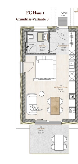 Willkommen in Ihrer neuen, charmanten Eigentumswohnung im Erdgeschoss (TOP 2.1) im malerischen Ennstal! Diese ca. 36 m² große Neubauwohnung ist ideal für Singles oder Paare und besticht durch ihre durchdachte Raumaufteilung sowie moderne Ausstattung. Mit einer ca. 9 m² großen, südseitigen Terrasse und einer süd-west-nordseitigen Ausrichtung genießen Sie eine angenehme Lichtatmosphäre und die Möglichkeit, die Sonne in vollen Zügen zu genießen.