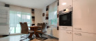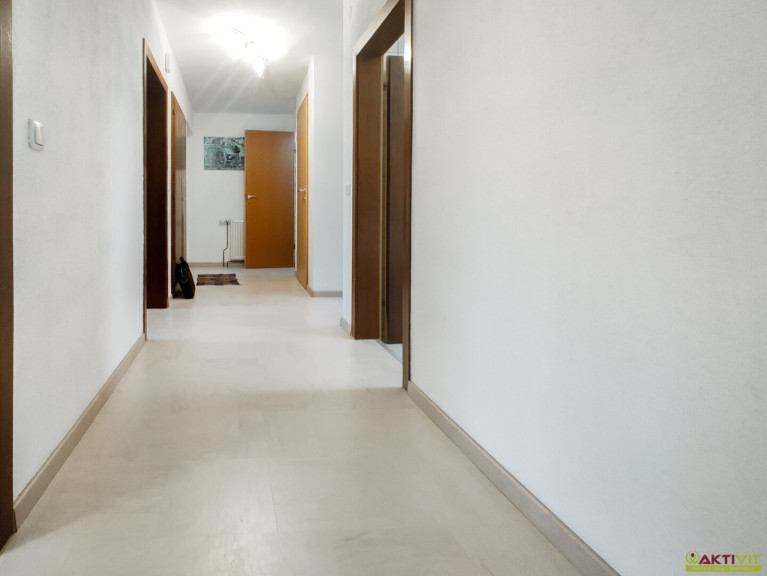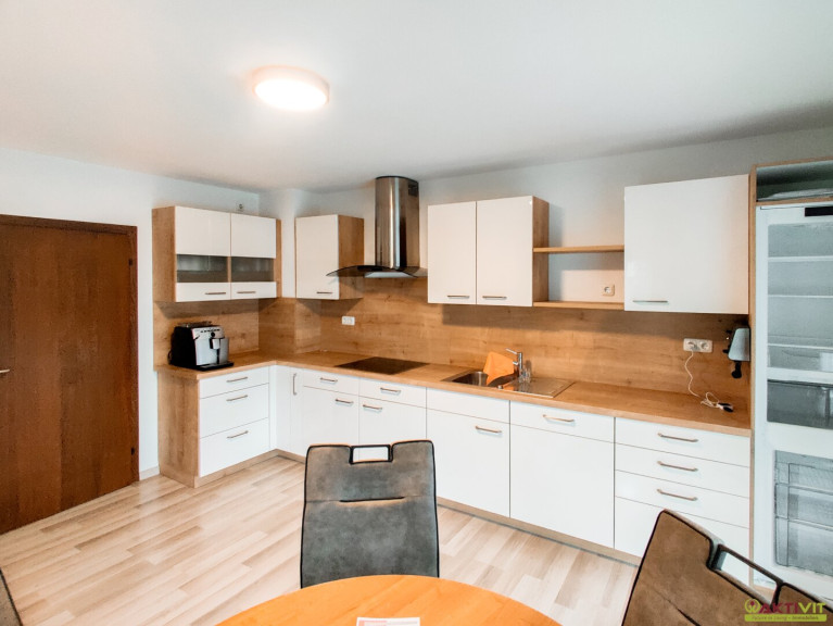 Die Böden bestehen aus Fliesen und Laminat. Die Einbauküchen sowie die Badezimmerausstattung sind im Kaufpreis inbegriffen. Beheizt wird das Objekt über eine zentrale Pelletsheizung. Das Haus ist voll unterkellert, die Kellerfläche beträgt ca. 40,4 m². Zusätzlich stehen eine Garage und vier Außenstellplätze zur Verfügung.