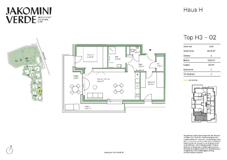 Die Top H3-02 ist ca. 68,48 m² groß, befindet sich im 3. Stock und hat folgende Räumlichkeiten: