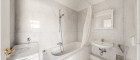 - Badezimmer mit Badewanne, Waschbecken und Waschmaschinenanschluss