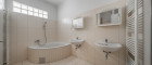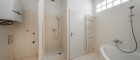 - Badezimmer mit Badewanne, Dusche, Waschbecken, Handtuchheizkörper und Waschmaschinenanschluss (mit Fenster)