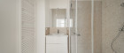 - Badezimmer mit Dusche, Waschbecken und Handtuchheizkörper