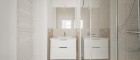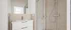 - Badezimmer mit Dusche, Waschbecken und Handtuchheizkörper