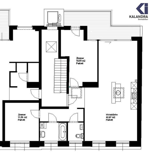 großzügigen 42m² Wohnzimmer. hochwertige Küche, Balkon mit 12,40m² ist sowohl vom Wohnzimmer als auch vom Schlafzimmer aus zugänglich