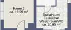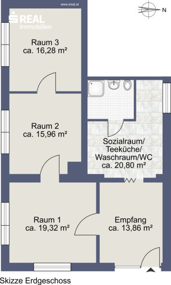 Die Nutzfläche von ca. 86 m² teilt sich wie folgt auf: Ein großzügiger Empfangsbereich, drei geräumige Büroräume, ein größerer Sozialraum inkl. kleiner Teeküche und abgetrennter Nassbereich mit WC, Dusche und Waschbecken.