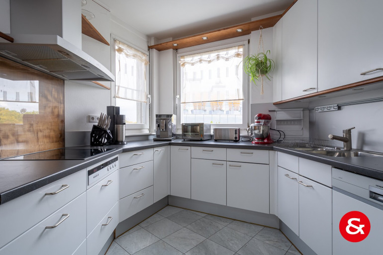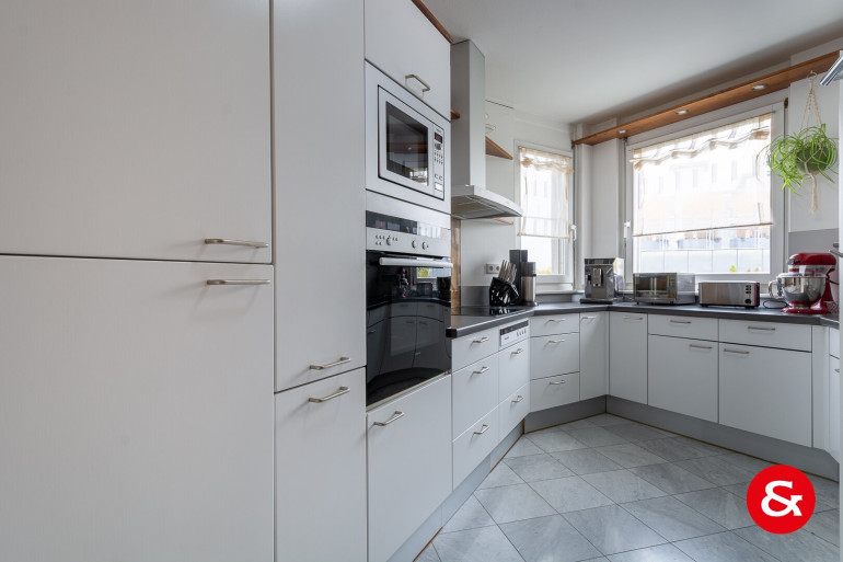 The apartment impresses not only with its size, but also with its high-quality furnishings. Tiles, parquet, and stone floors lend the rooms an elegant touch, while underfloor heating ensures a comfortable living environment. The modern, spacious fitted kitchen with natural light is the perfect place to create culinary masterpieces.