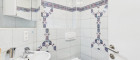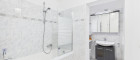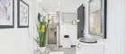 Badezimmer mit Wanne und extra WC, ein Schlafzimmer, ein offener Wohn-Essbereich mit moderner, eleganter Einbauküche und direktem Zugang zu beiden großzügigen Terrassen und dem Garten mit eingebautem Pool.