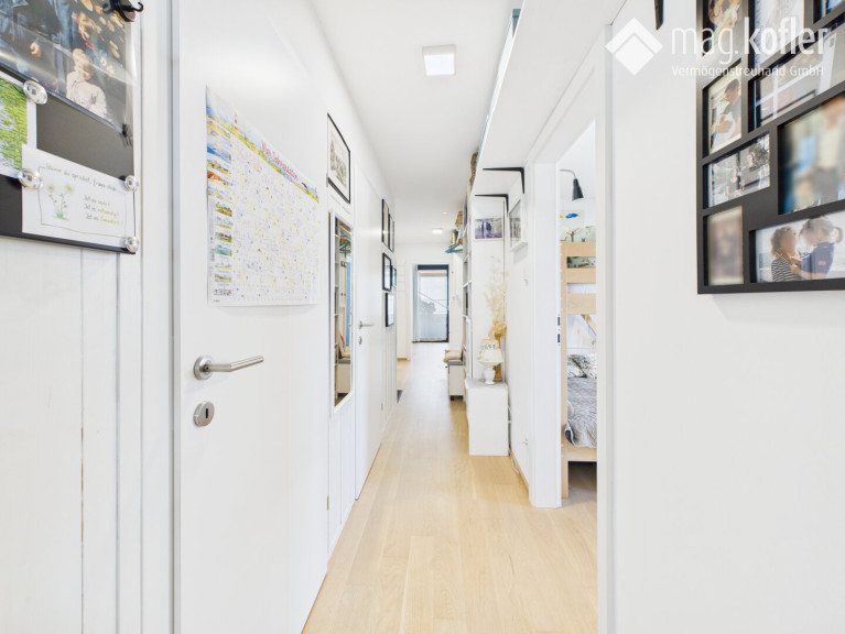 Zwei weitere Zimmer bieten flexible Gestaltungsmöglichkeiten – ob als Schlafzimmer, Gästezimmer oder als Büro. Das Bad überzeugt mit modernem Design, während ein separates WC zusätzlichen Komfort bietet.