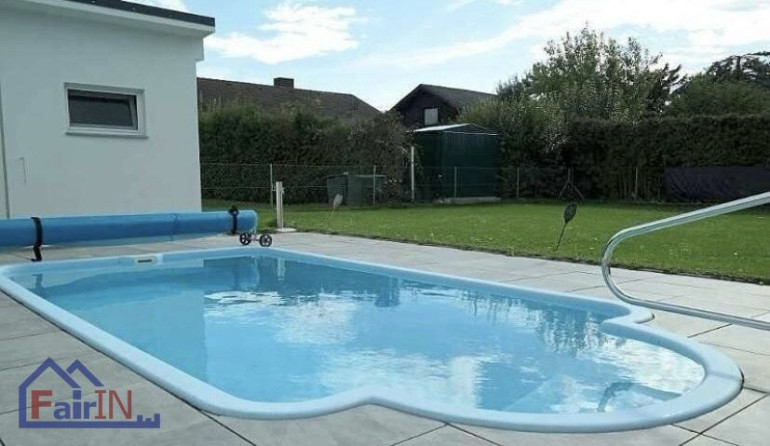 Fliesen, Laminatboden, Parkett, Gas, Etagenheizung, Kamin, Einbauküche, Bad mit Fenster, Dusche, Garage, Swimmingpool, Wasch/Trockenraum