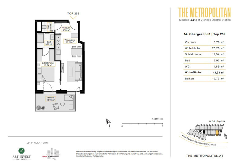 Hippe Cafés, coole Bars und jede Menge Unbeschwertheit: The Metropolitan liegt an der schillernden Vienna Central Station zwischen dem modernen Quartier Belvedere und dem grünen Sonnwendviertel. Hier können Sie abseits des Mainstreams der Stadt abhängen und originelle Shops, Lokale, Kunst- und Kulturangebote sowie Frischluft in grünen Parkanlagen vor der Haustüre genießen. Zahlreiche attraktive Plätze laden zum Verweilen, Bewegen und Staunen ein. In nur wenigen Schritten sind die Bezirke Wieden, Landstraße und das historische City Center erreichbar. Ob Tennis im Arsenal, zeitgenössische Kunst im Belvedere 21 oder ein Cocktail auf der Rooftop-Bar gegenüber – in der Karl-Popper-Straße 5 kann man eins werden mit dem pulsierenden Stadtleben und zwischendurch Ruhe in den benachbarten und üppig grünen Parks finden. Alles ist möglich – an diesem einmaligen Standort.