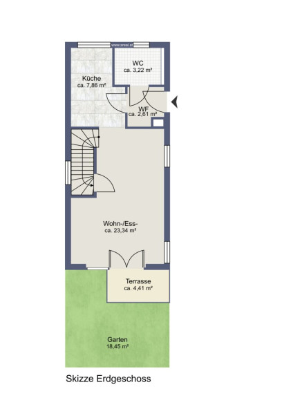 Im Erdgeschoss erwartet Sie ein großzügiger Wohnbereich, der direkten Zugang zum Wintergarten sowie zur Terrasse bietet. Von hier aus gelangen Sie in den ca. 18,5 m² großen Garten, der mit Terrasse und Pool der perfekte Ort zum Entspannen und Genießen der frischen Luft ist.