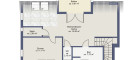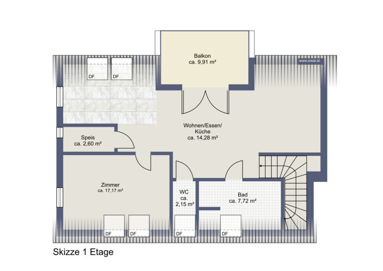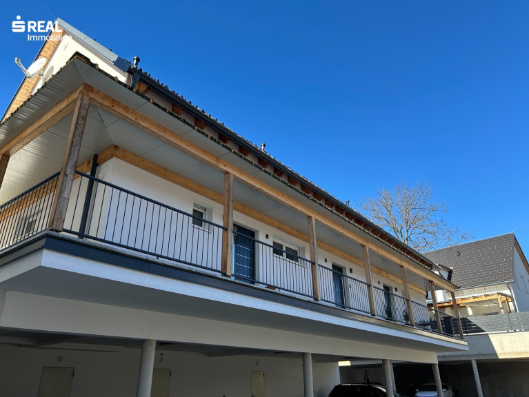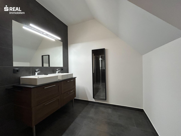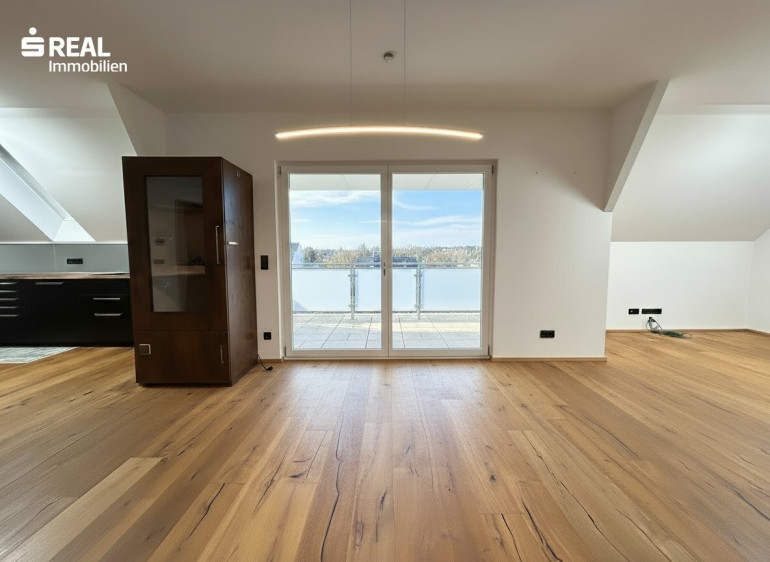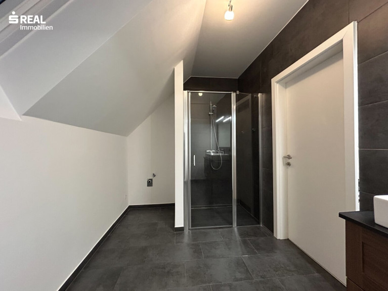 Der Vorraum im unteren Stockwerk führt über eine Treppe in den großzügigen Wohnbereich, der durch ein Dachfenster besonders hell und einladend wirkt. Der offene Wohnbereich geht nahtlos in die geräumige, moderne Küche über, die perfekt für gesellige Kochabende geeignet ist. Vom Wohnzimmer aus gelangen Sie auf den überdachten Balkon, von dem aus Sie einen schönen Blick ins Grüne genießen können – ideal für entspannte Stunden im Freien.