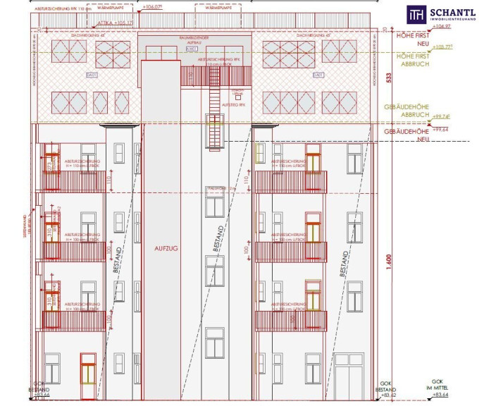 Bewilligt wurde ein Dachgeschossausbau im 1. und 2. Dachgeschoss des Gebäudes zur Schaffung von zwei Maisonettewohnungen, inkl. Freiflächen in Form von Terrassen.
