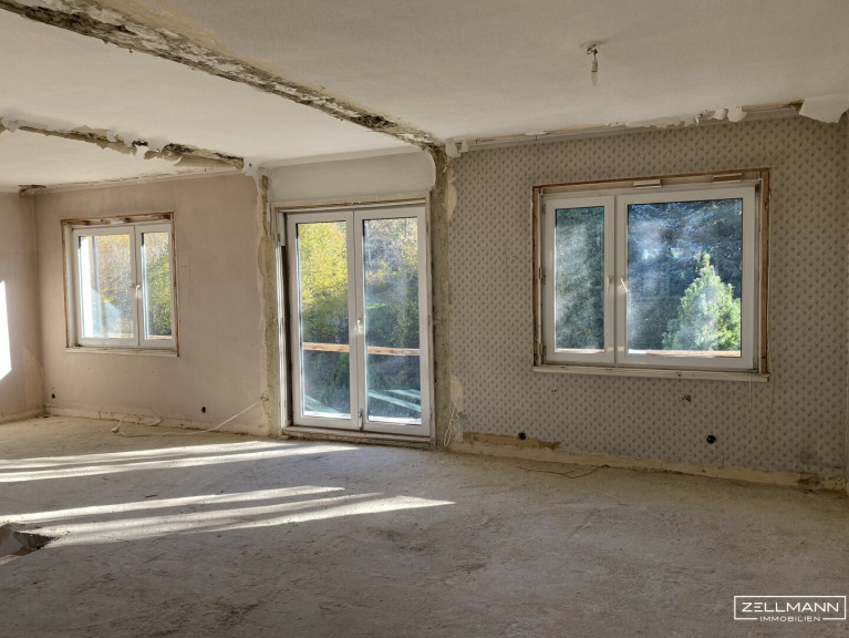 Auf dem Grundstück befindet sich derzeit ein entkerntes Bestandsgebäude. Fenster, Türen und die Dachhaut sind noch vorhanden, sodass das Haus trocken ist und ein solider Ausgangspunkt für eine Sanierung oder einen Neubau besteht.