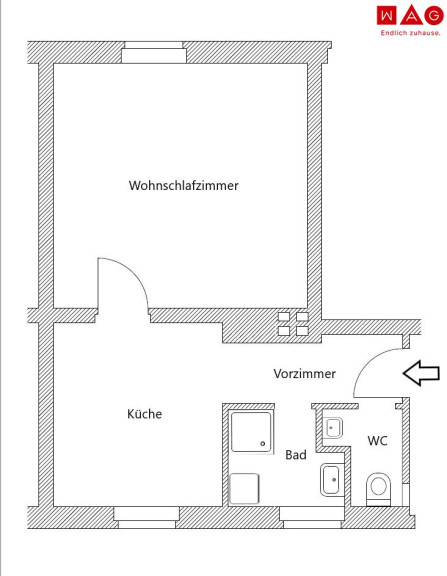 Die Wohnung teilt sich wie folgt auf: Vorzimmer / Küchenbereich / Wohnschlafraum / Badezimmer mit Dusche und Tageslichtfenster /separates WC mit Waschbecken und Tageslichtfenster