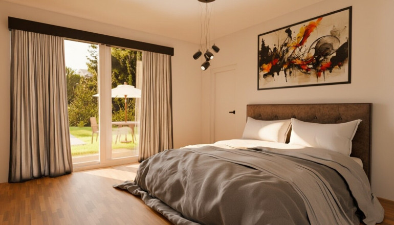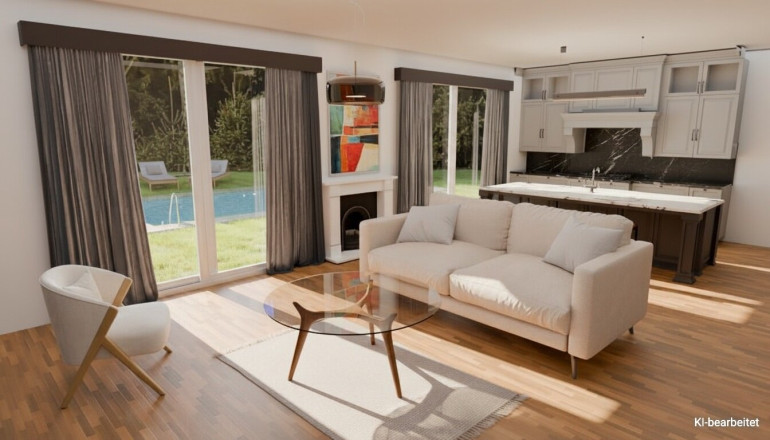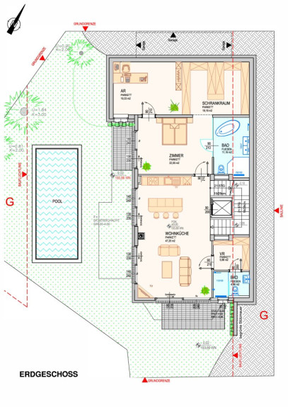Erdgeschoss: Wohnküche mit Zugang zum Garten (357,81 m²), Pool (3 x 8m mit Anschlüssen), Vorraum, Bad (Dusche/ WC), Schlafzimmer mit en-suite Bad (Wanne/ Dusche/ WC), Schrankraum und Arbeitszimmer