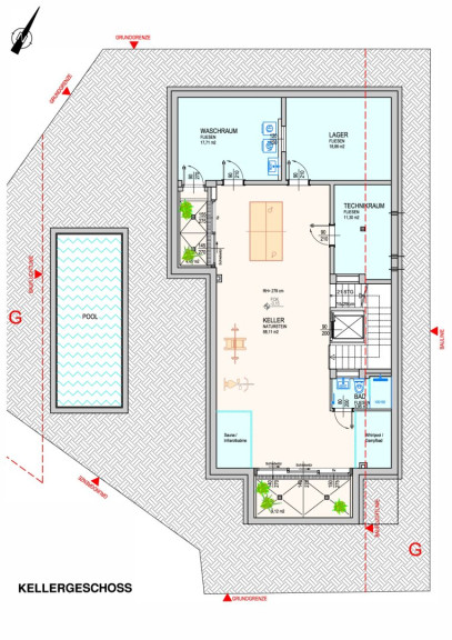 Kellergeschoss: Keller (Fitness/ Aufenthaltsraum), Sauna/ Infrarotkabine, Whirlpool/ Dampfbad, Bad (Dusche/ WC), Technikraum, Lager, Waschraum und Lichtschacht (Aussenbereich 9,12 m² + 4,45 m²)