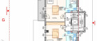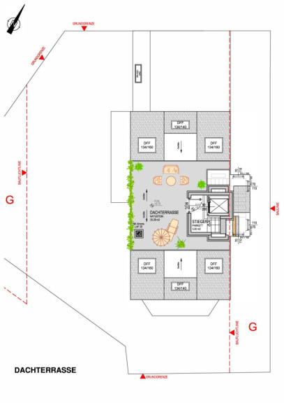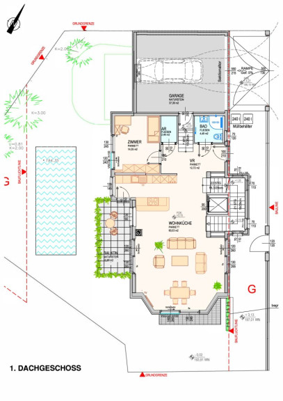 1. Dachgeschoss: Vorraum, Wohnküche mit Zugang zum Balkon (12,88 m²), Garten (44,92 m²), Zimmer, Abstellraum, Bad (Dusche/ WC) und Garage (37,39 m²)