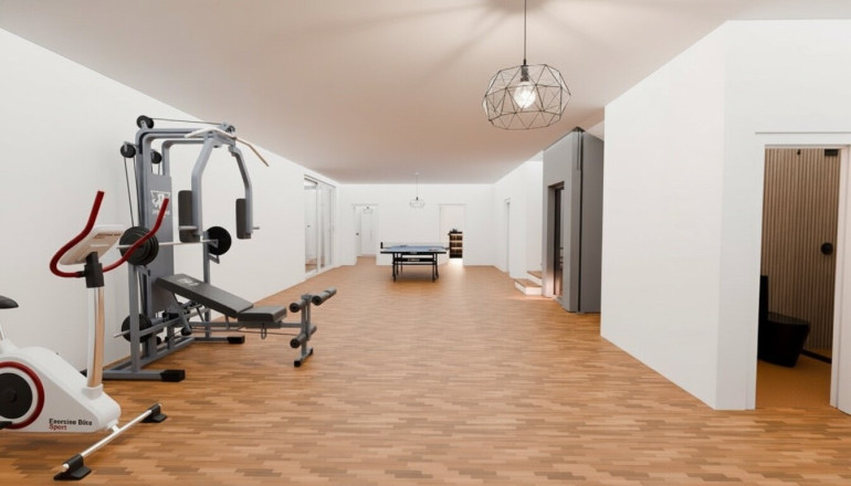 Kellergeschoss: Keller (Fitness/ Aufenthaltsraum), Sauna/ Infrarotkabine, Whirlpool/ Dampfbad, Bad (Dusche/ WC), Technikraum, Lager, Waschraum und Lichtschacht (Aussenbereich 9,12 m² + 4,45 m²)