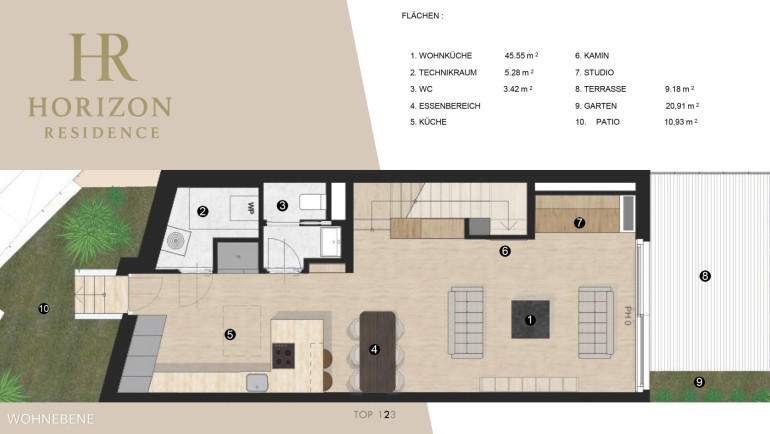 Wohnebene: Wohnküche und Essbereich mit Zugang auf die Terrasse und Garten, sowie charmanter Patio-Garten, Technikraum, WC