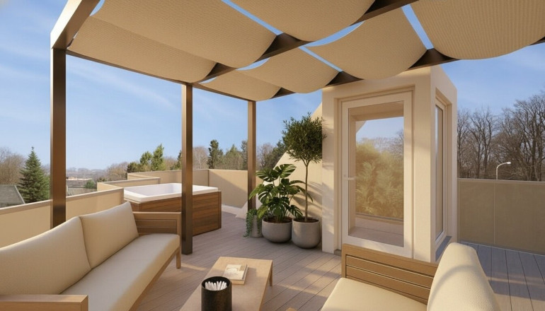 - Dachterrassen mit Vorbereitung für individuelle Kundenwünsche wie Dusche Whirlpool, Outdoor-Küche. Großformatige Feinsteinzeugbeläge für eine pflegeleichte und stilvolle Gestaltung.