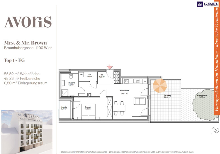 Wohnfläche: ca. 56,69m² + Loggia: ca. 3,38m² + Terrasse: ca. 24,46m² + Garten: ca. 20,39m² + Kellerabteil: ca. 0,8m²