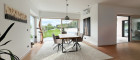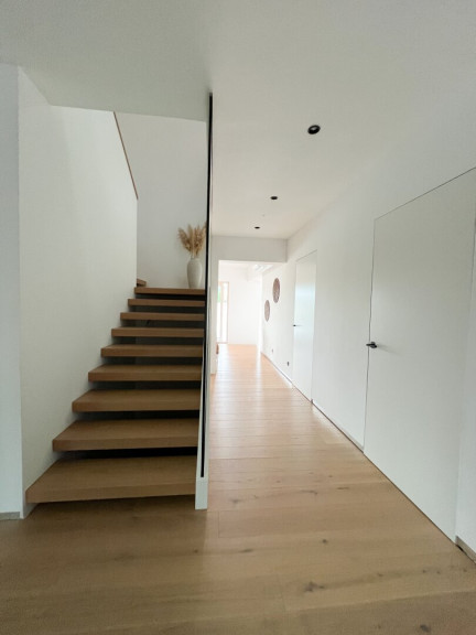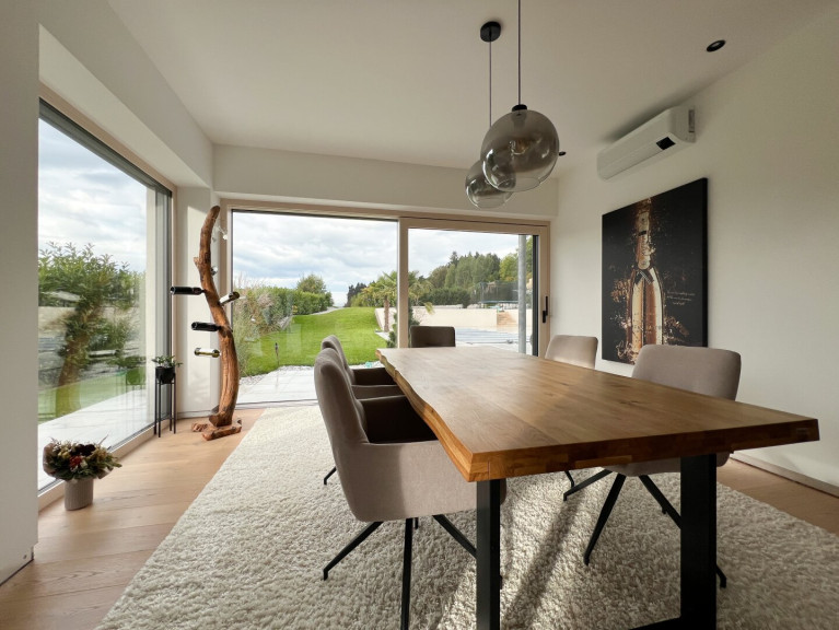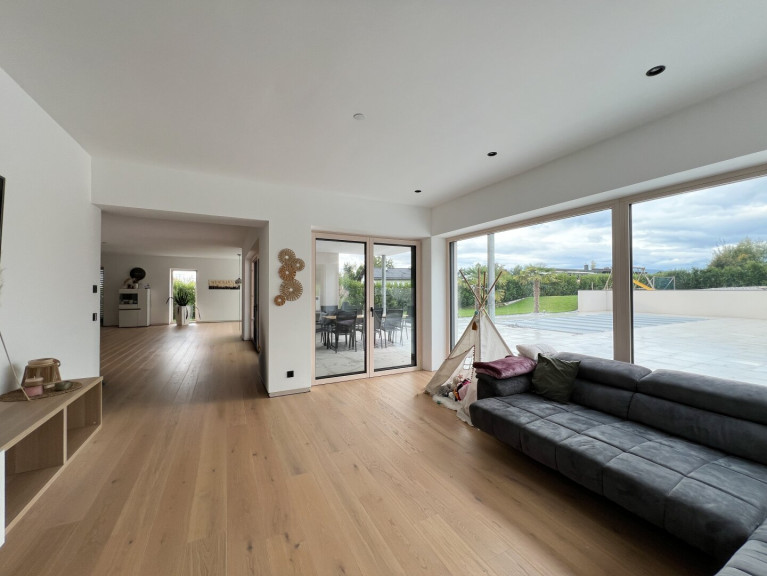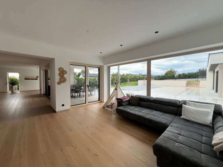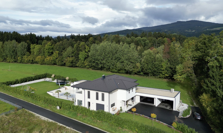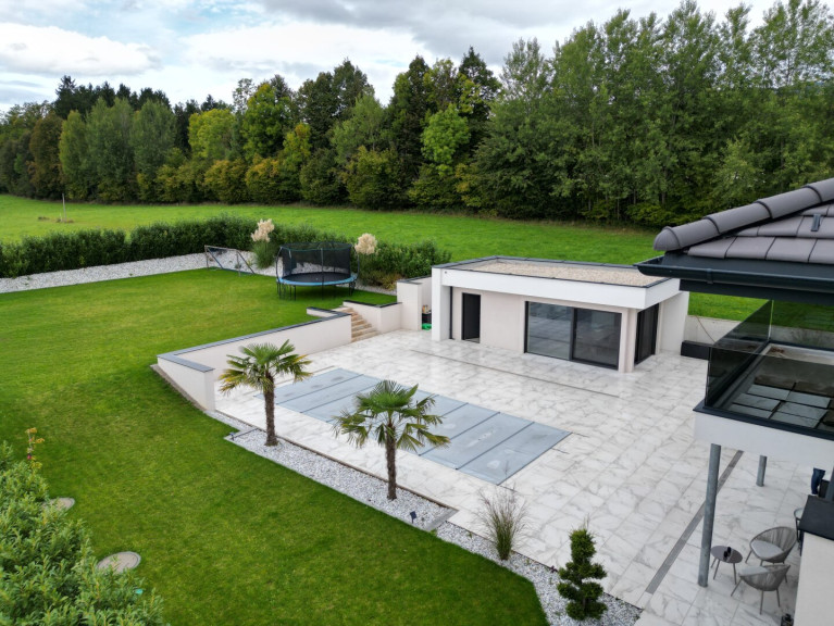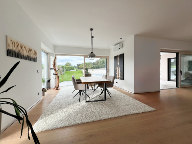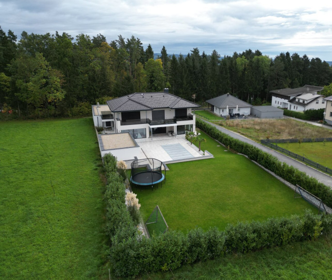 Dieses moderne Einfamilienhaus bietet Ihnen alles, was Sie sich für ein komfortables und stilvolles Wohnen wünschen. Am Rande einer Siedlung mit Einfamilienhäusern liegt, umgeben von Wäldern und Wiesen, das moderne Haus mit Pool samt Poolhaus. Schon die Zufahrt des Hauses lässt die Großzügigkeit erahnen welche sich im Inneren widerspiegelt. Ein durchdachtes Wohnkonzept mit viel Platz in jedem Raum ist ideal für Familien. Lichgebend in jedem Zimmer sind die großen Fenster. Unterstrichen wird diese Helligkeit durch klare Formgebung und Holzböden in feinmaseriger Eiche. Küche und Bäder können noch nach Ihren persönlichen Wünschen und Vorstellungen gestaltet werden. Der Garten, welcher in zwei Ebenen unterteilt ist, bietet Platz zum Spielen untertags und fröhliche Empfänge am Abend. Für Badespaß und Entspannung sorgt der große Pool welcher mit einem Poolhaus komplettiert wird. Für Ihr Fahrzeug ist ebenfalls gesorgt: Eine Garage und zusätzliche, überdachte Stellplätze stehen zur Verfügung, sodass Sie Ihre Autos bequem und sicher parken können.