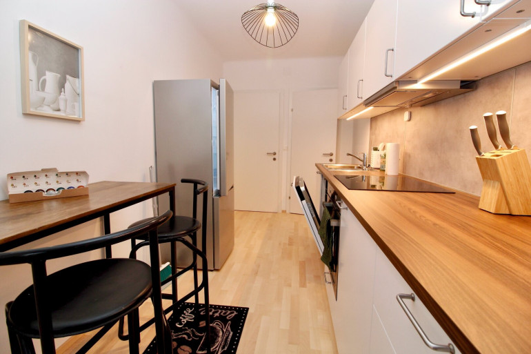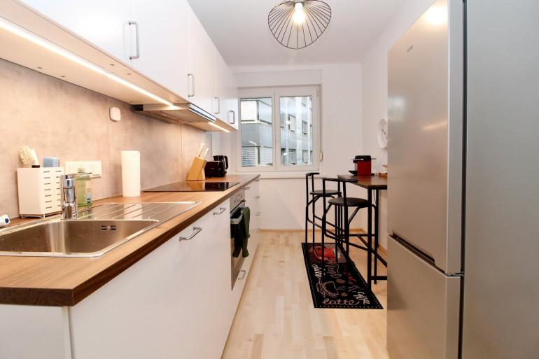 Beim Betreten der Wohnung werden Sie sofort von einem Gefühl der Helligkeit und Großzügigkeit empfangen. Die modernisierten Fliesen und Parkettböden verleihen der Wohnung ein zeitgemäßes und stilvolles Ambiente. Die hochwertige Einbauküche lädt zum Kochen und Genießen ein und bietet ausreichend Stauraum für Ihre Küchenutensilien.