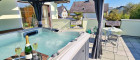 Auch im Obergeschoß lässt sich die frische Luft im Freien auf ~ 36m² so richtig genießen: Einen gemütlichen Kaffee mit Blick ins Grüne, sprudelndes Wasser im beheizten und überdachten Whirlpool ...