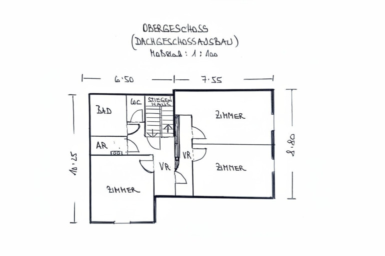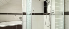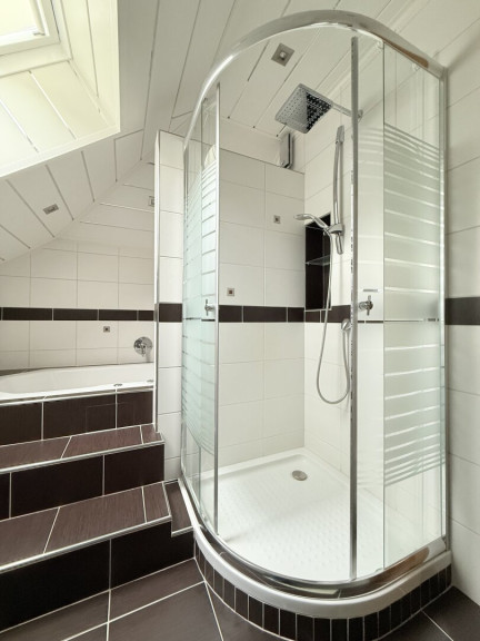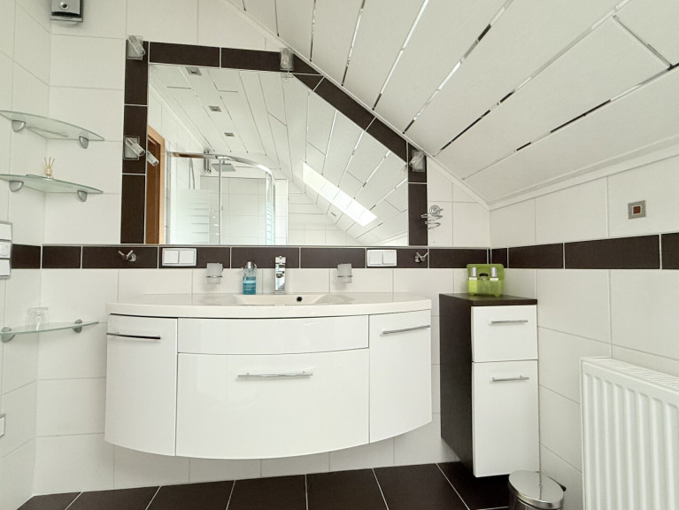Hier befinden sich 3 Zimmer, ein weiteres Badezimmer mit Badewanne, Dusche und Fenster, ein WC und ein Vorraum.