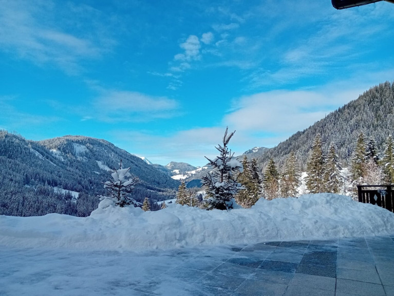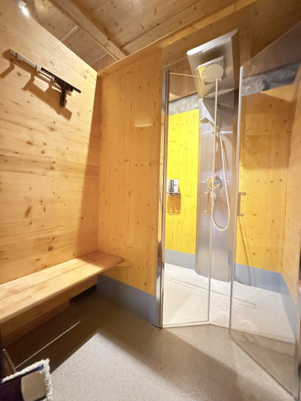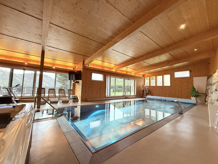 Ein besonderes Highlight ist der 157 m² große Wellness-Bereich im Erdgeschoss, ausgestattet mit Fußbodenheizung, einem Edelstahl-Hallenbad (10m x 4m), einem Jacuzzi, Dusche, WC und großzügigen Liegeflächen. Der Wellness-Bereich eignet sich hervorragend für Familien mit Kindern, da er absperrbar ist und die Terrasse mit der angrenzenden Grünanlage im Westen sicher eingezäunt ist. Große Fensterflächen ermöglichen einen atemberaubenden Blick auf die Berge und bieten Zugang zur uneinsehbaren Terrasse und zum uneinsehbaren Grünbereich.