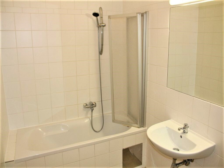 + Badezimmer mit Badewanne, Waschtisch und Waschmaschinenanschluss