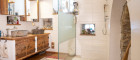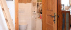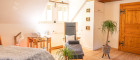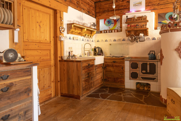 Das Herzstück bildet die voll ausgestattete Landhausküche mit Gasherd, Holzofen, Vorratskammer und Essbereich. Ein großzügiges Bad mit Regenwalddusche, zwei Waschbecken und stilvollen Holzelementen schafft ein besonderes Ambiente.