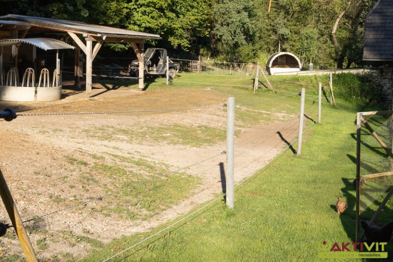Das Grundstück bietet vielfältige Nutzungsmöglichkeiten: Pferdekoppeln, Obstbäume, Hochbeete, Wildbach und eine eigene Quelle schaffen ein seltenes Naturidyll. Der Reitplatz sowie der große Scheunentrakt ergänzen das Ensemble perfekt.