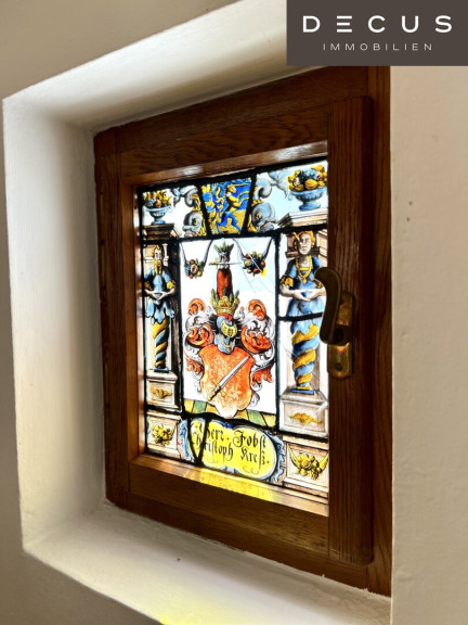 Der Renaissancebau besticht durch historische Elemente wie eine straßenseitig angebrachte Sonnenuhr aus dem Jahr 1564, Bleiglasfenster, Inschriften, Skulpturen, barocke Kamine, imposante Luster, historisches Mauerwerk, eine Vielzahl an Kreuzgewölben, Ziegeleindeckung (Wiener Tasche). Speckstein - und Terrazzoböden auch in den Wohnräumen, Parkette, Flügeltüren bzw. Stiltüren in Holz massiv mit schmiedeeisernen Beschlägen.