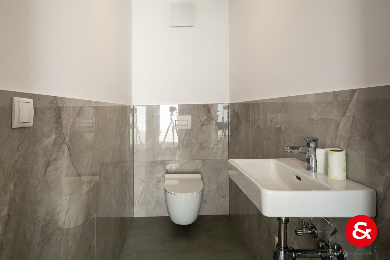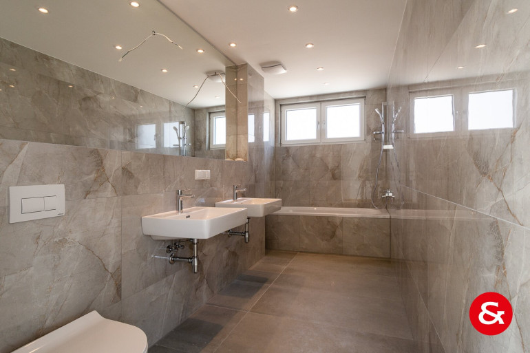 Alle Nassräume (entweder mit Dusche oder Badewanne) sind mit wunderschönen, großflächigen Feinsteinzeugfliesen versehen und wirken sehr modern und stylisch. Toiletten befinden sich sowohl im EG, als auch im 1. und 2. OG.