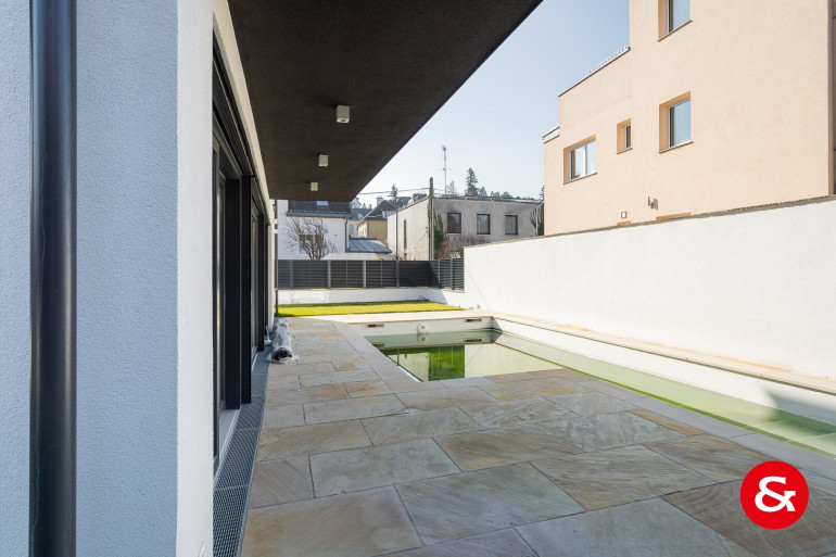 Der von 3 Seiten an das Haus grenzende Garten kann im EG durch 2 Terrassenschiebetüren betreten werden. Eine große Terrassen liegt zwischen dem 8 x 4 Meter Pool und dem Haus. Im 1. OG aber auch im zweiten gibt es zusätzliche Freiflächen durch einen Balkon, eine Loggia und einen Westterrasse.