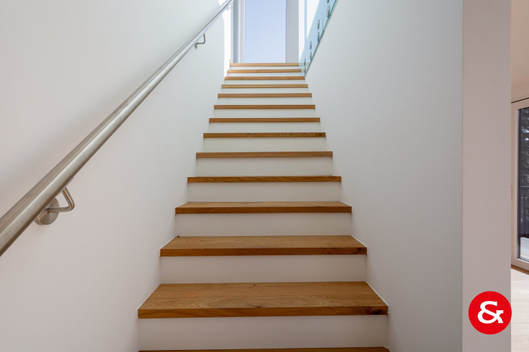 Über eine, mit Eichenholz belegte Treppe gelangt man in das 1. OG: